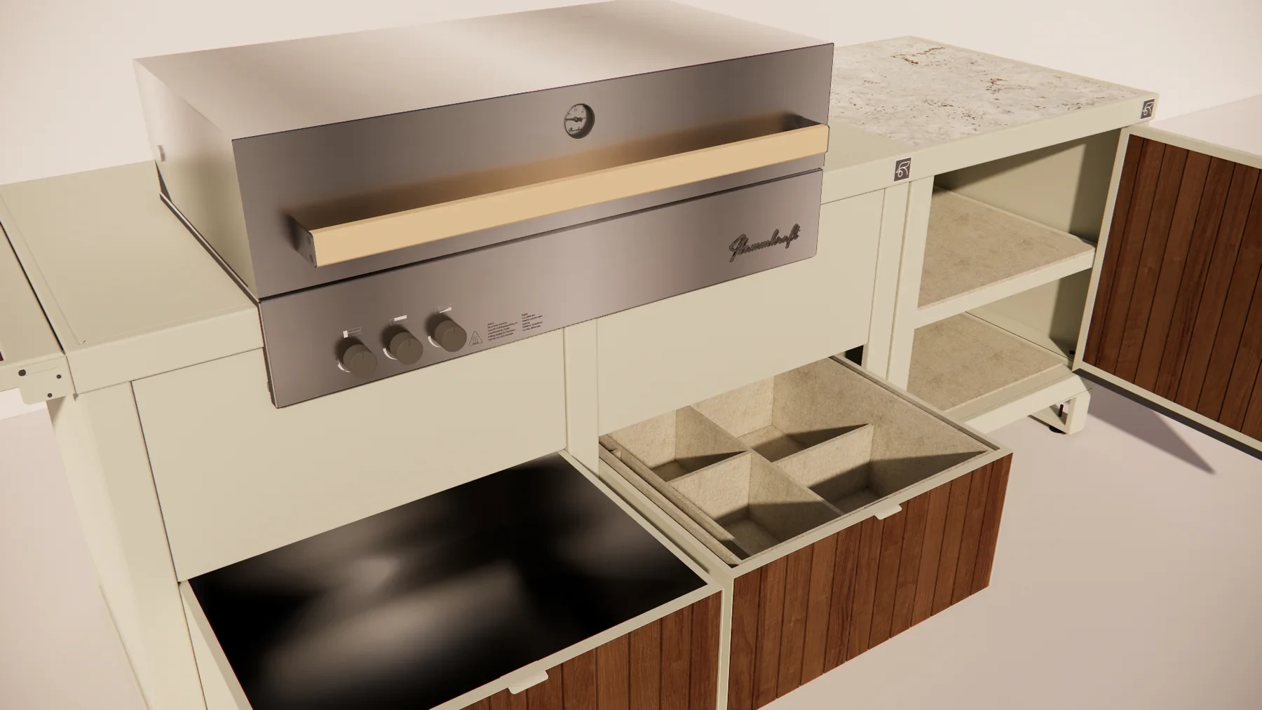 This setup combines modern design with high-quality materials that can withstand the elements. The sleek, modular design fits perfectly into any outdoor space – from a modern garden to a cozy patio. Thanks to the clear layout, everything is within easy reach: cooking comfort, workspace, and storage, fully integrated into one harmonious whole.