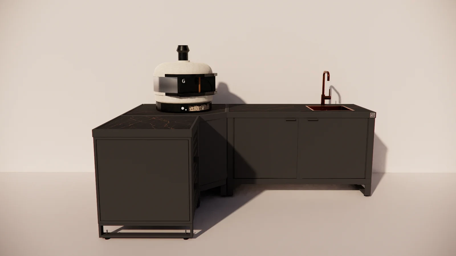 Het robuuste Rubix Corner Frame biedt plaats aan een grote kamado of pizzaoven, terwijl het Single Frame en Duo Frame zorgen voor een optimale indeling met extra opbergruimte, een geïntegreerde koelkast en een luxe spoelunit. Zo heb je alles wat je nodig hebt binnen handbereik voor een complete buitenkookervaring.