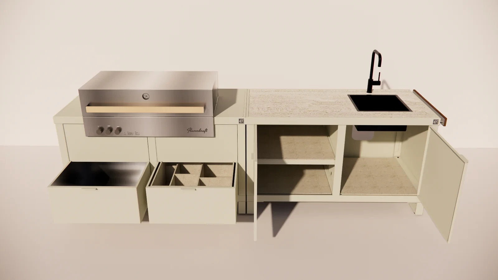 The first Duo Frame houses the powerful gas barbecue, allowing you to enjoy direct heat and maximum temperature control. The second Duo Frame is designed as a sink unit, ideal for rinsing ingredients, cleaning dishes, or simply washing your hands while cooking.