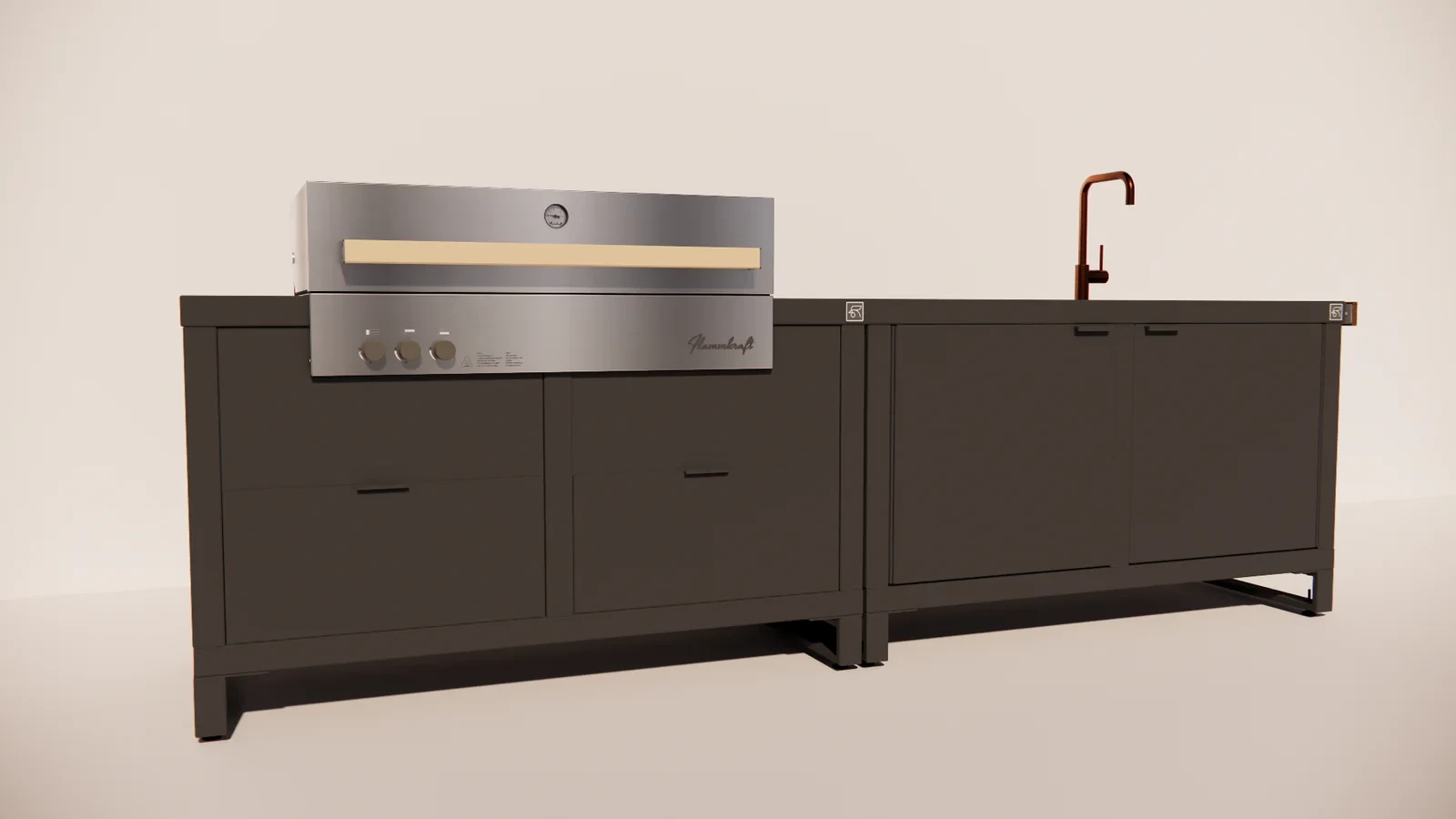 The Roostr Gas BBQ – 3-Piece Rubix Duo GAS with Duo Frame is a high-quality outdoor kitchen from the Rubix GAS series, designed for outdoor chefs who want to combine design and functionality. This spacious setup consists of a Duo Gas Frame with a powerful gas barbecue and a second Duo Frame with an integrated sink and generous storage space.
