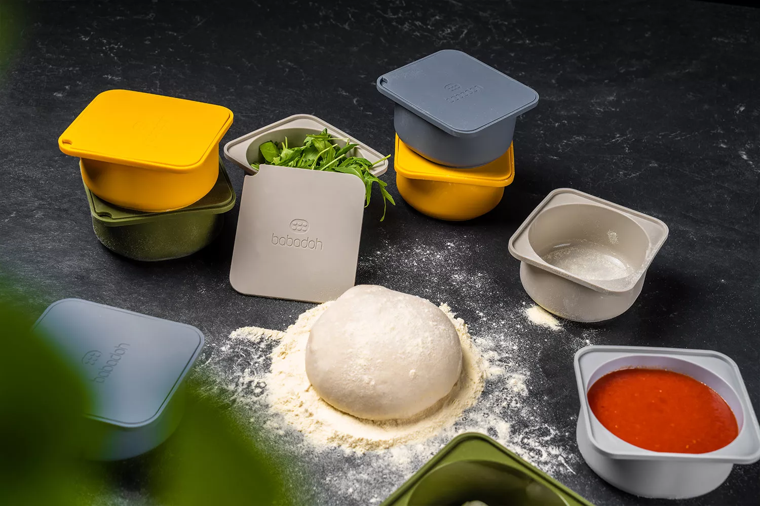 The Babadoh range includes various silicone dough and storage containers , practical dough crates for larger quantities, and a cleverly designed lid that doubles as a cutting board . All products are flexible, oven- and microwave-safe up to 200 degrees Celsius, stackable, and easy to clean. They are ideal for use at home, outdoors, or on the go, and are available in various colors and sizes.