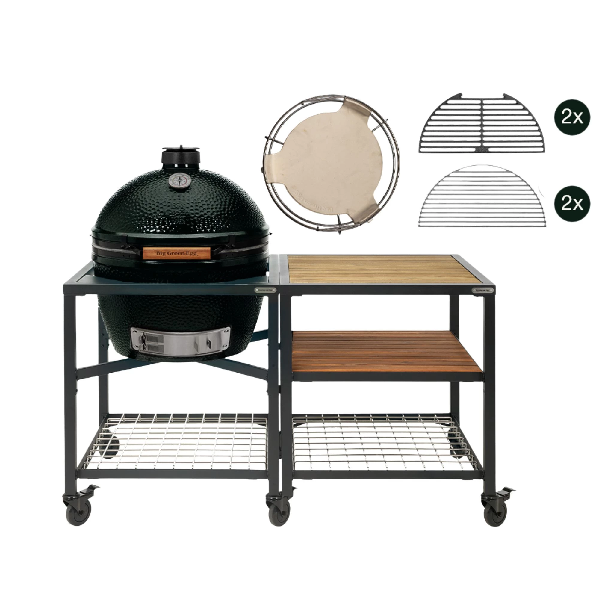 The package includes, among other things, an EGG Frame, Expansion Frame, Stainless Steel Grid Insert, two Acacia Wood Inserts, and three swivel casters. This provides you with extra workspace and a practical layout while cooking outdoors. Additionally, the convEGGtor, convEGGtor Basket, and half cast iron and stainless steel grates ensure great flexibility for direct and indirect cooking.
