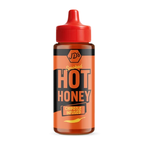 JD’s Hot Honey Smoked is een unieke combinatie van zoete honing en rokerige chipotle chili. Deze Mexicaans geïnspireerde saus brengt een diepe, rokerige warmte samen met een zachte honingzoetheid en geeft gerechten direct extra karakter.