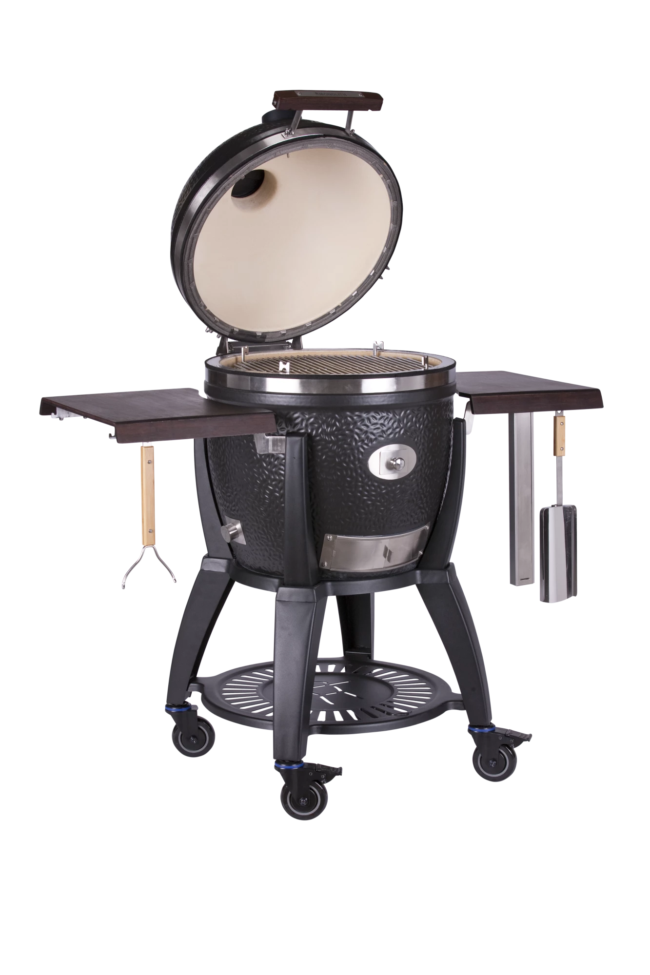 A leading kamado grill, embodying both innovation and tradition, redefining the art of barbecuing. Its unique silicate ceramic handles every challenge, from succulent steaks to smoky vegetables. Its elegant design, featuring a durable satin-matte glaze and optional carbonized heavy bamboo side tables, combines visual beauty with functionality.