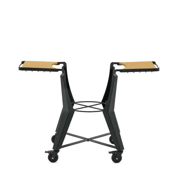The light bamboo side tables create a stylish contrast with the matte black steel frame, giving the whole a modern and robust look. The base also features practical hanging hooks for grilling tools and accessories, and smooth caster wheels that allow you to move your kamado effortlessly.
