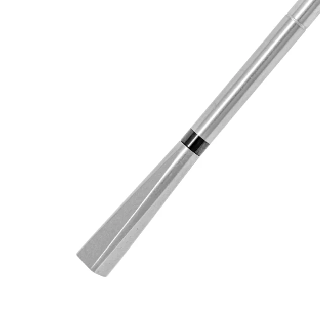 The probe itself is approximately 125 mm long and approximately 5 mm wide. There is a pointed end for inserting it into the meat and a mark on the stainless steel indicating how far into the meat the probe should be. There's a thin ceramic band on the top to send the readings back to your smartphone or tablet and a square end that must remain outside the meat for measuring the ambient temperature.
