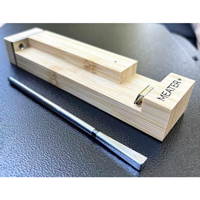 The Meater 2 Plus comes in a small wooden holder that acts as a base station and charger for the probe. It has a beautiful design with a small housing (157 x 23 x 37 mm) and therefore fits perfectly on your kitchen countertop, in a drawer, outdoor kitchen or on your refrigerator or on another cool metal surface thanks to the magnets on the back.