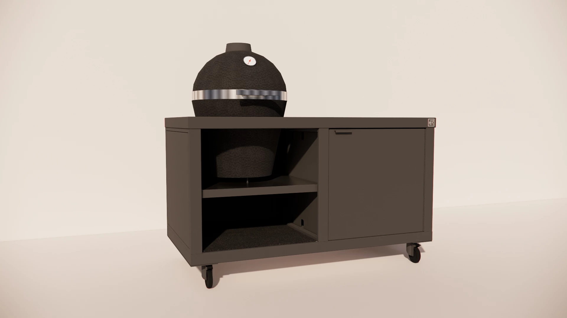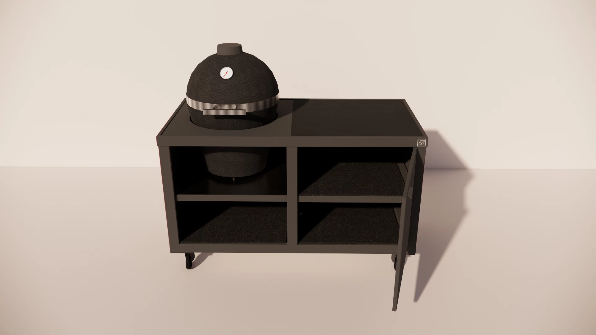 De inlay is speciaal afgestemd op de kamado, waardoor een strak en naadloos geheel ontstaat. De praktische opbergplank en de afsluitbare deur aan de rechterzijde bieden volop ruimte om je BBQ-accessoires, houtskool en gereedschap netjes op te bergen.