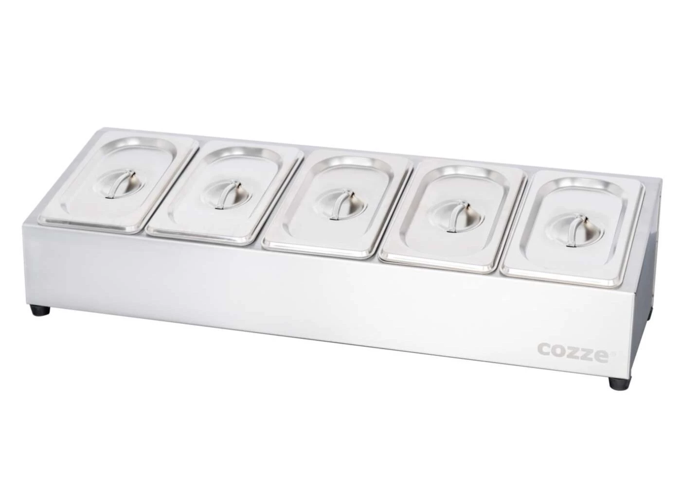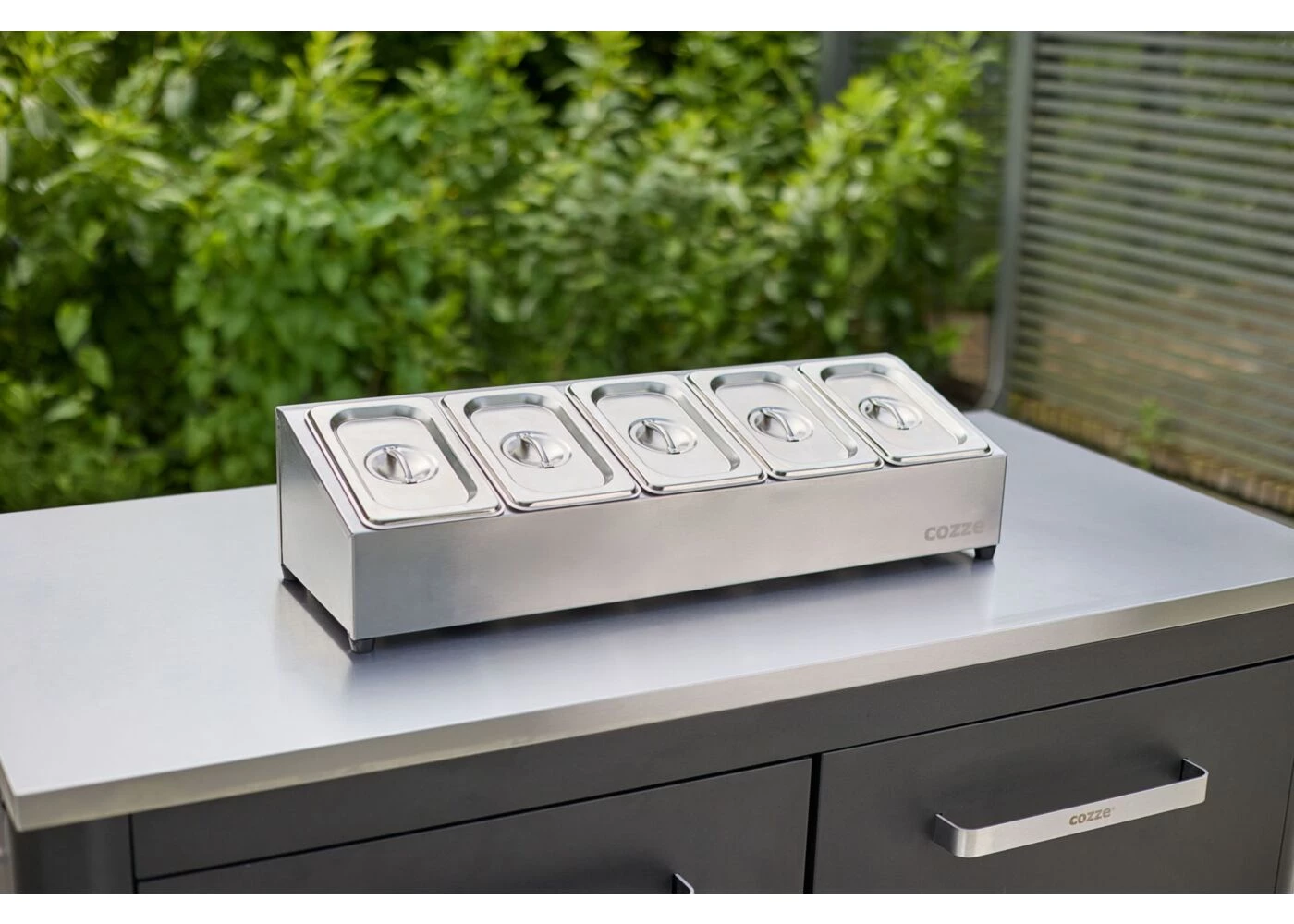 Make cooking even easier with the Cozze Topping Station with 5 Cups and Lids. This sturdy stainless steel station provides an organized and hygienic way to store toppings, condiments or sauces while cooking. Ideal for barbecuing, making pizza or other culinary creations. The included lids ensure that ingredients stay fresh and are protected from dust and dirt.