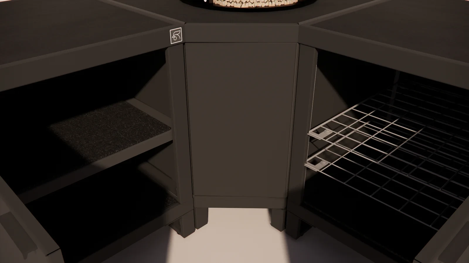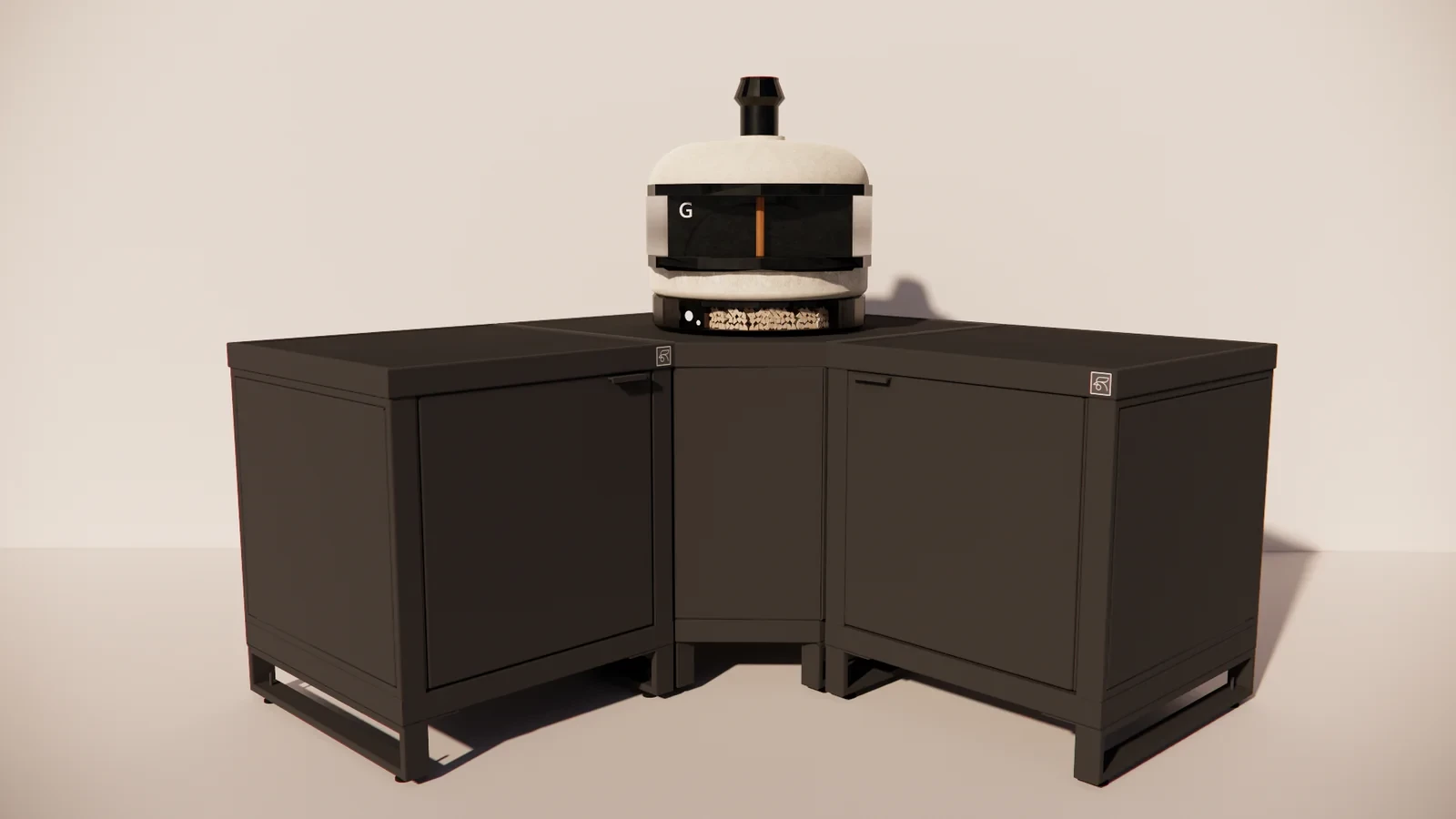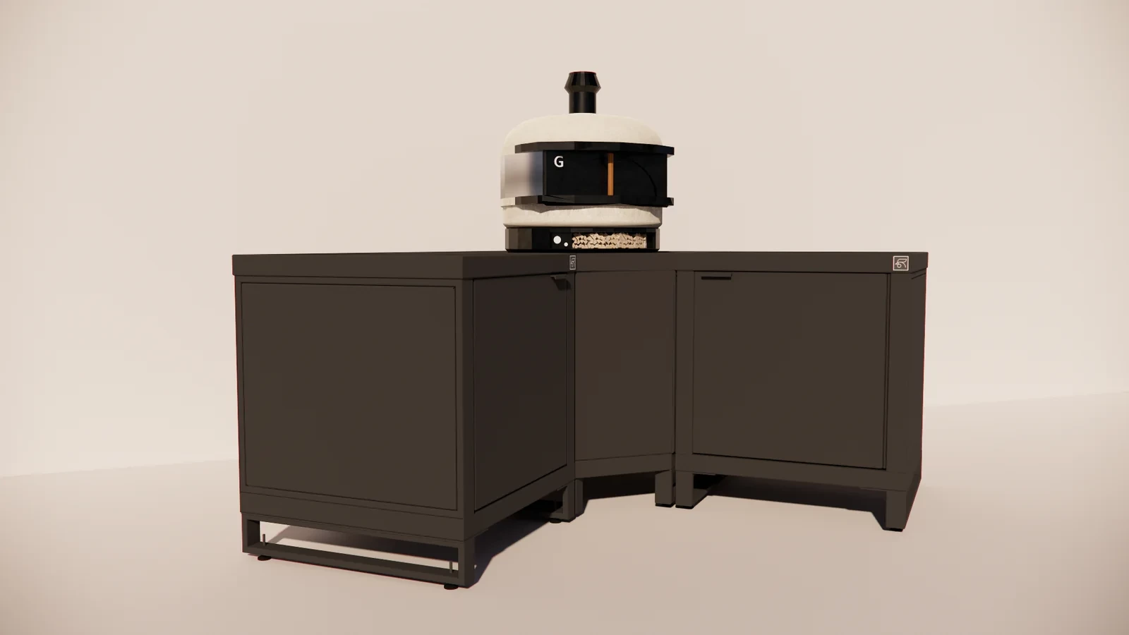 Het ontwerp biedt voldoende ruimte voor een grote kamado zoals de Big Green Egg XL of XXL, maar ook voor een pizzaoven van Gozney, Alfa of Ooni. De twee Single Frames zorgen voor extra werkruimte en opbergmogelijkheden, waardoor je tijdens het koken alles binnen handbereik hebt.