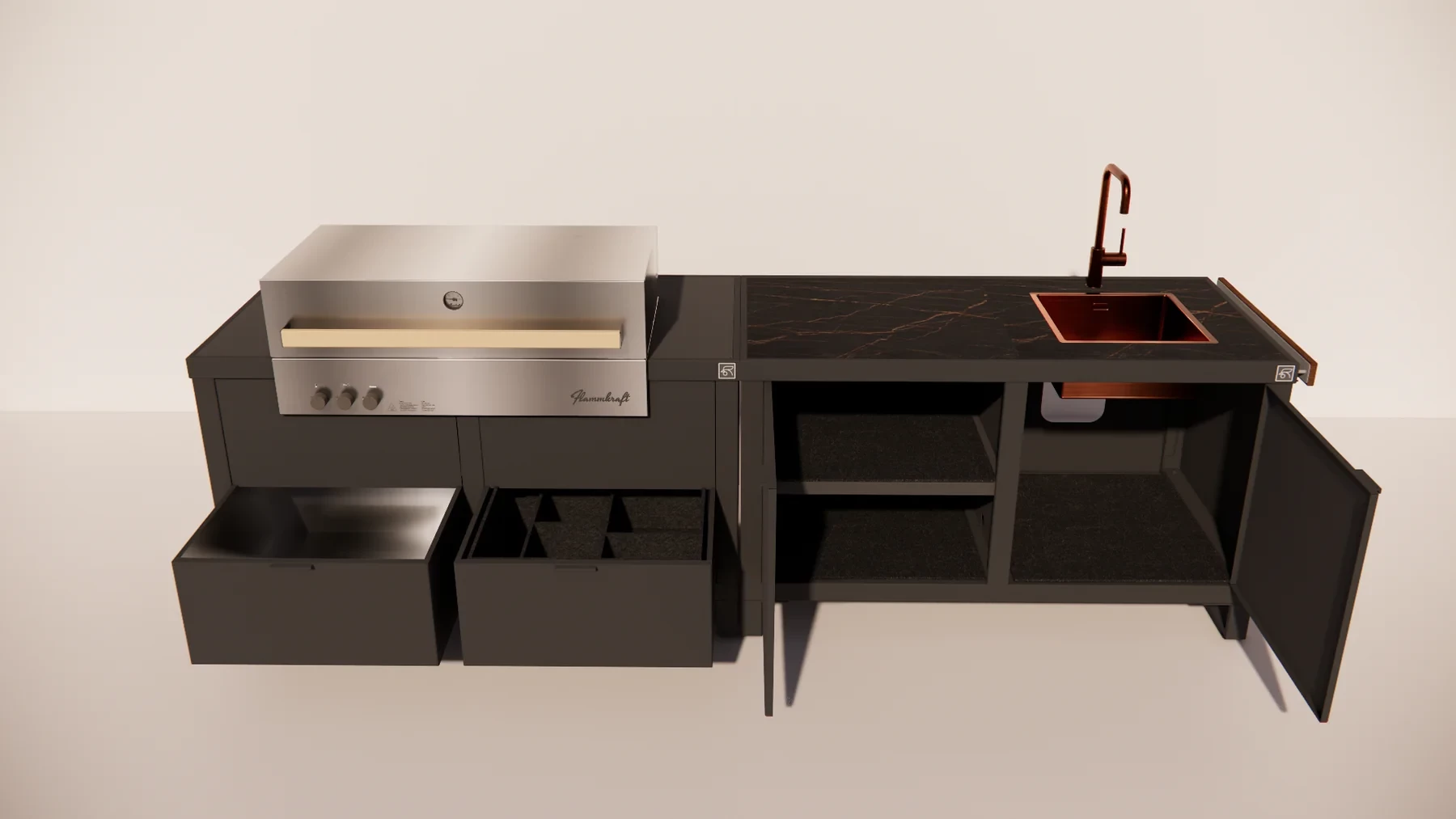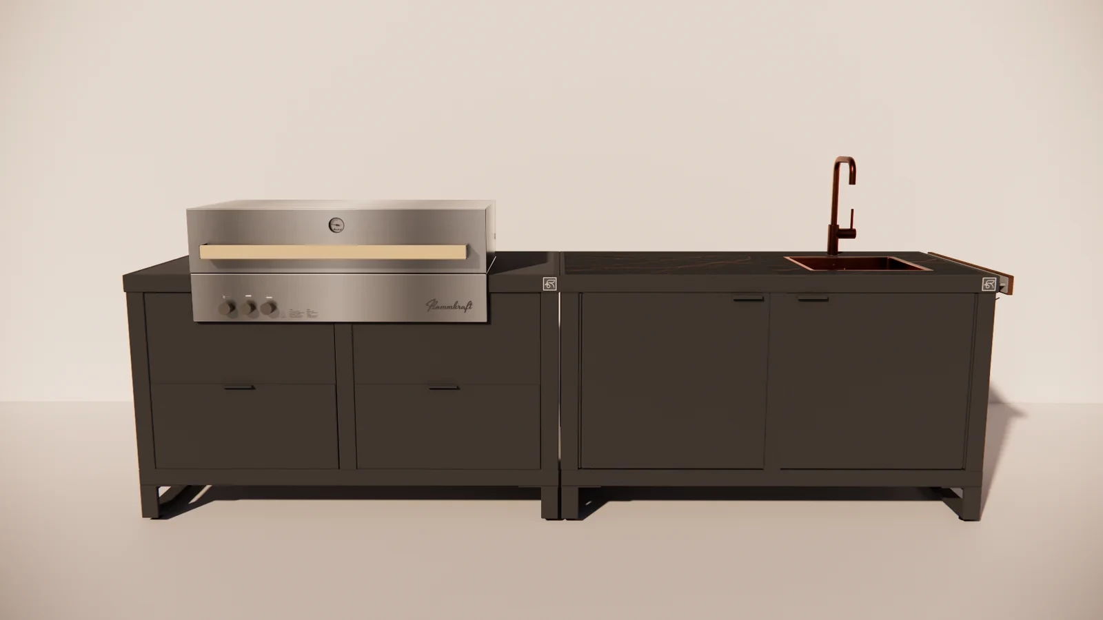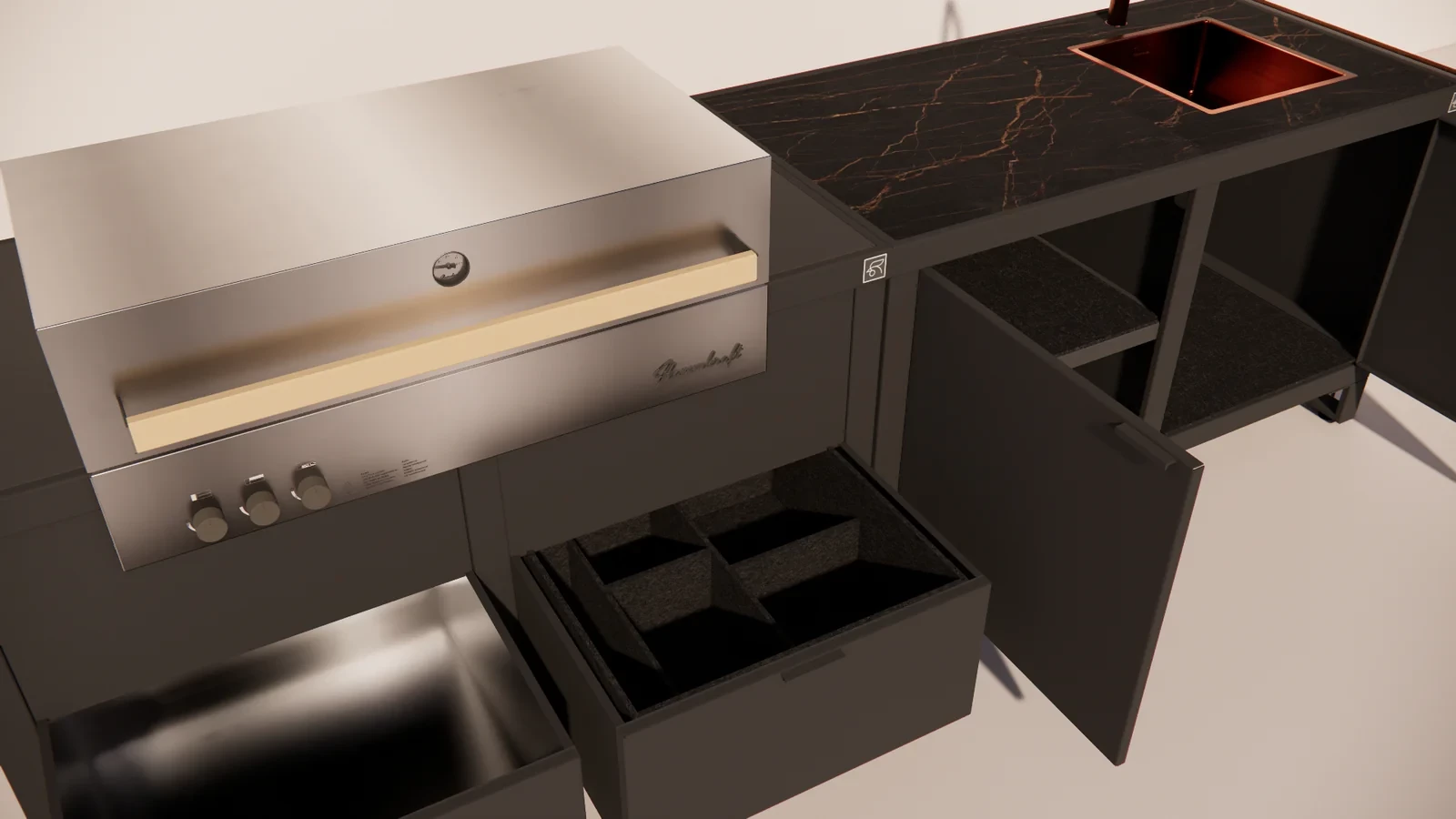 The gas barbecue offers direct heat, optimal temperature control, and professional performance, ideal for both quick preparations and slow-grilled dishes. The sink unit allows you to wash ingredients and rinse dishes without leaving your outdoor kitchen – everything within easy reach in a single, well-organized setup.