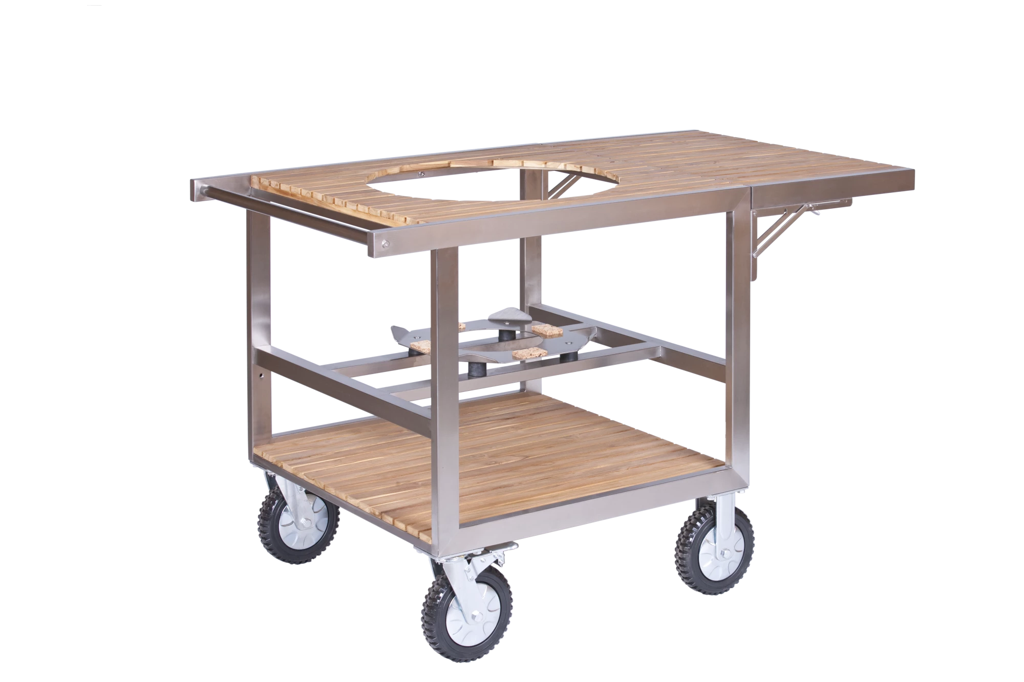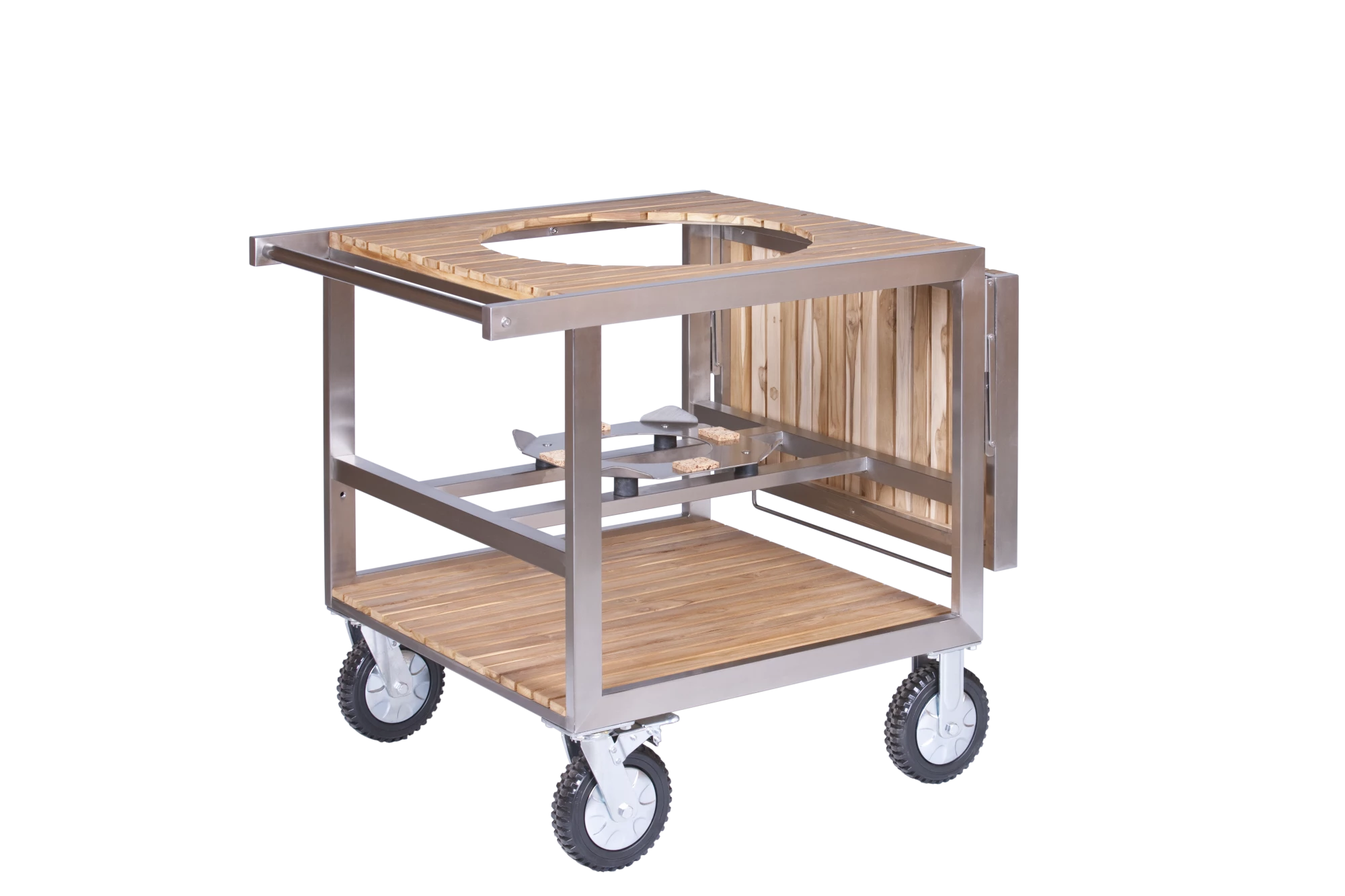 Crafted from high-quality stainless steel and teak wood, the Monolith Classic Buggy provides effortless mobility for your Monolith Kamado. The barbecue rests on a solid stainless steel support with 4 rubber shock absorbers, which can be securely locked for extra stability during use and transport. Thanks to the non-slip PU wheels with a diameter of 20 cm, the Buggy is extremely mobile. Suitable for both home use in the garden and in the professional sector, including caterers, restaurants, street food events and BBQ teams. Transform your barbecue experience with this functional and stylish buggy.