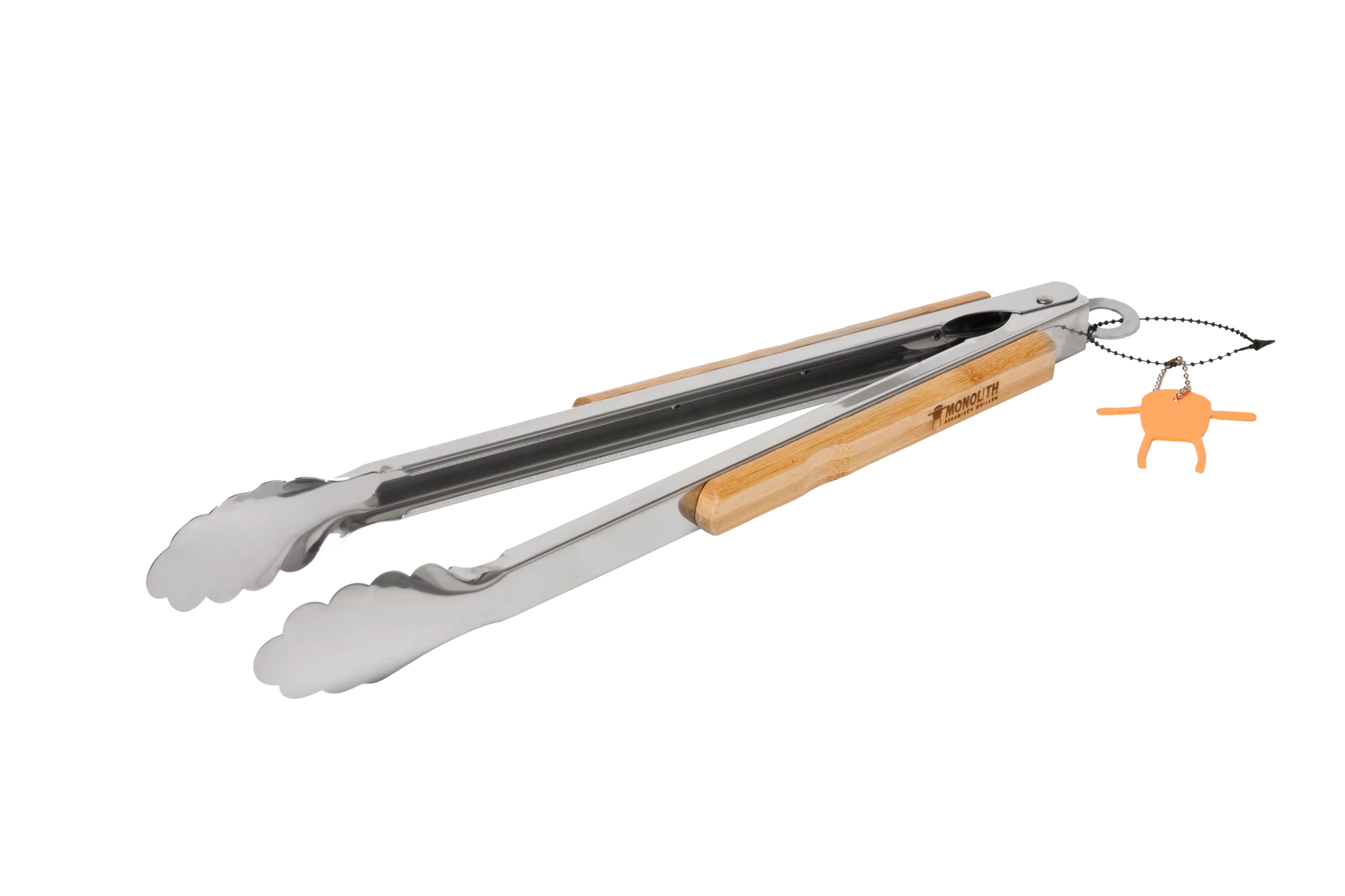 A robust grill tongs, made of polished stainless steel and equipped with an ergonomic bamboo handle. The locking mechanism allows compact storage.