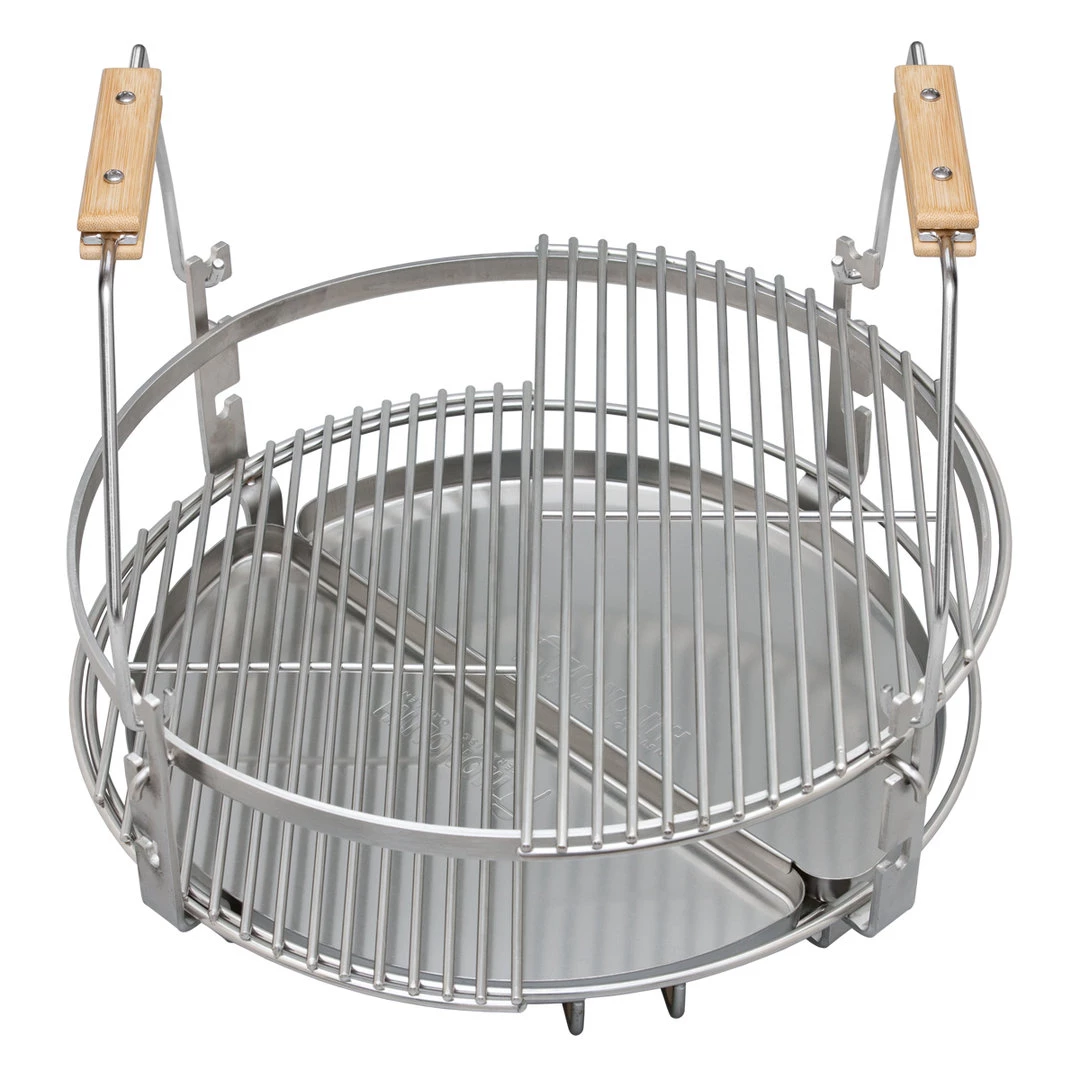 A leading kamado grill, embodying both innovation and tradition, redefining the art of barbecuing. Its unique silicate ceramic handles every challenge, from succulent steaks to smoky vegetables. Its elegant design, featuring a durable satin-matte glaze and optional carbonized heavy bamboo side tables, combines visual beauty with functionality.