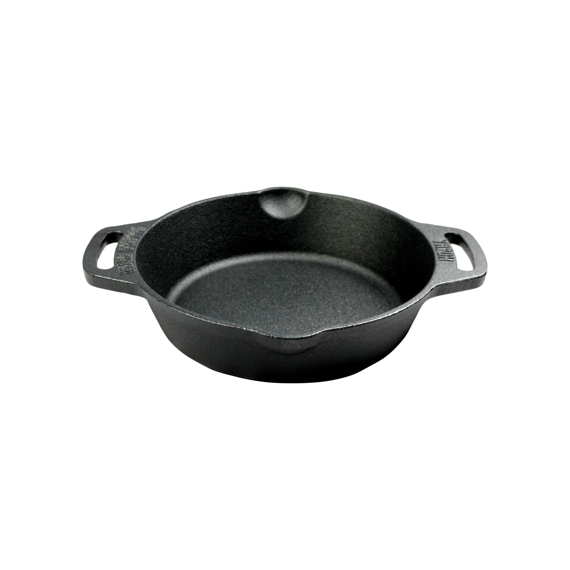 The Valhal Outdoor pan is a compact skillet, a frying pan made entirely of cast iron with a diameter of 20 cm. Thanks to two handles, it is more compact than a skillet with a handle, ideal for barbecue or oven use. This versatile pan is perfect for serving tapas dishes or starters, and the handy pouring spouts make sauces easy. Cast iron, suitable for any heat source, offers the option of heating dishes at high temperatures and retaining heat well. Careful use and care will ensure a lifelong pan, as cast iron can be re-fired over and over again. Valhal Outdoor's cast iron items are already treated with natural oil, but additional firing is recommended for optimal baking results. Use the Valhal Outdoor wax for specific care and burning of cast iron.