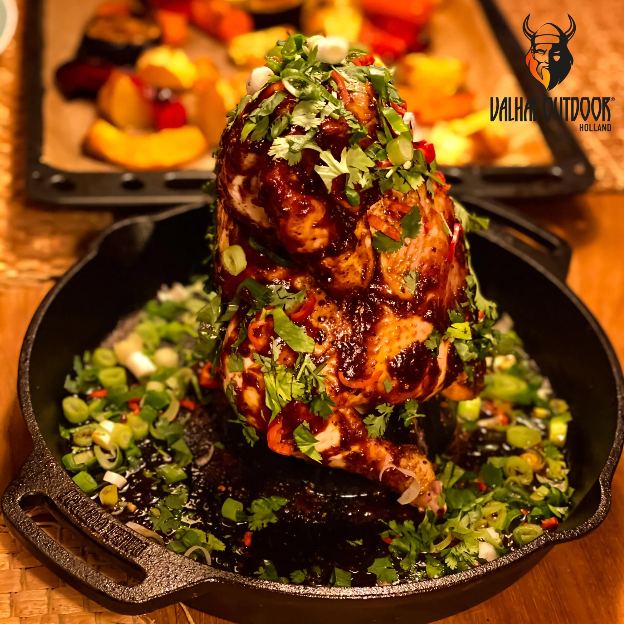 This Valhal Outdoor pan is a chicken sitter, also known as a poultry pan or chicken holder. The term poultry pan describes it better, as it can be used in many different ways. The chicken sitter has a holder for spices or cooking liquid to soak into the poultry. With a rim to collect delicious juices, you can make gravy or prepare side dishes at the same time. Cooking poultry upright ensures it cooks evenly with a crispy crust. Made entirely of cast iron, this pan benefits from the benefits of high heating and good heat retention. Suitable for all heat sources, both indoors and outdoors. Cast iron improves with use and care, and can be re-fired every time for a like-new pan. Valhal Outdoor items are already fired in the factory, but for optimal results it is recommended to fire the cast iron itself a few more times. Use the Valhal Outdoor wax for special care and burning of cast iron.