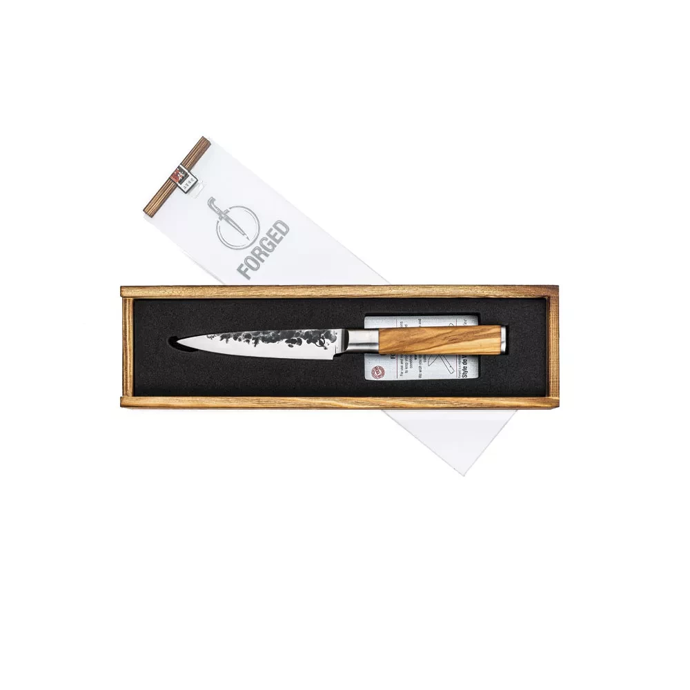 The Forged Olive Universal knife, a compact version of the chef's knife, is perfect for cutting vegetables and smaller meat pieces. The narrow blade offers exceptional precision. Made from Japanese 440C steel with a hardness of 58 Rockwell, each knife is hand forged, has a blade thickness of 2 mm and a cutting angle of 18 degrees. Packaged in a luxurious wooden box and with a 10-year warranty. Discover the versatility and durability of the Forged Olive Universal Knife for every kitchen job.