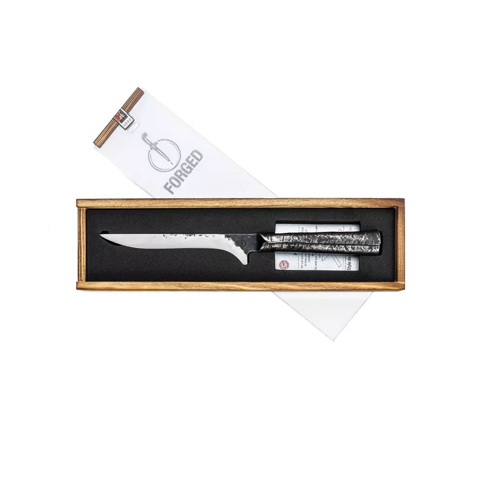 The Forged Brute boning knife is designed for precise boning of meat and poultry. With its long and slim blade you can effortlessly cut along bones. Made from Japanese 440C steel with a hardness of 58 Rockwell, hand forged for uniqueness. The knife has a blade thickness of 2 mm and a cutting angle of 18 degrees. Packaged in a luxurious wooden box and with a 10-year warranty. Experience the perfect combination of precision and craftsmanship with the Forged Brute boning knife.