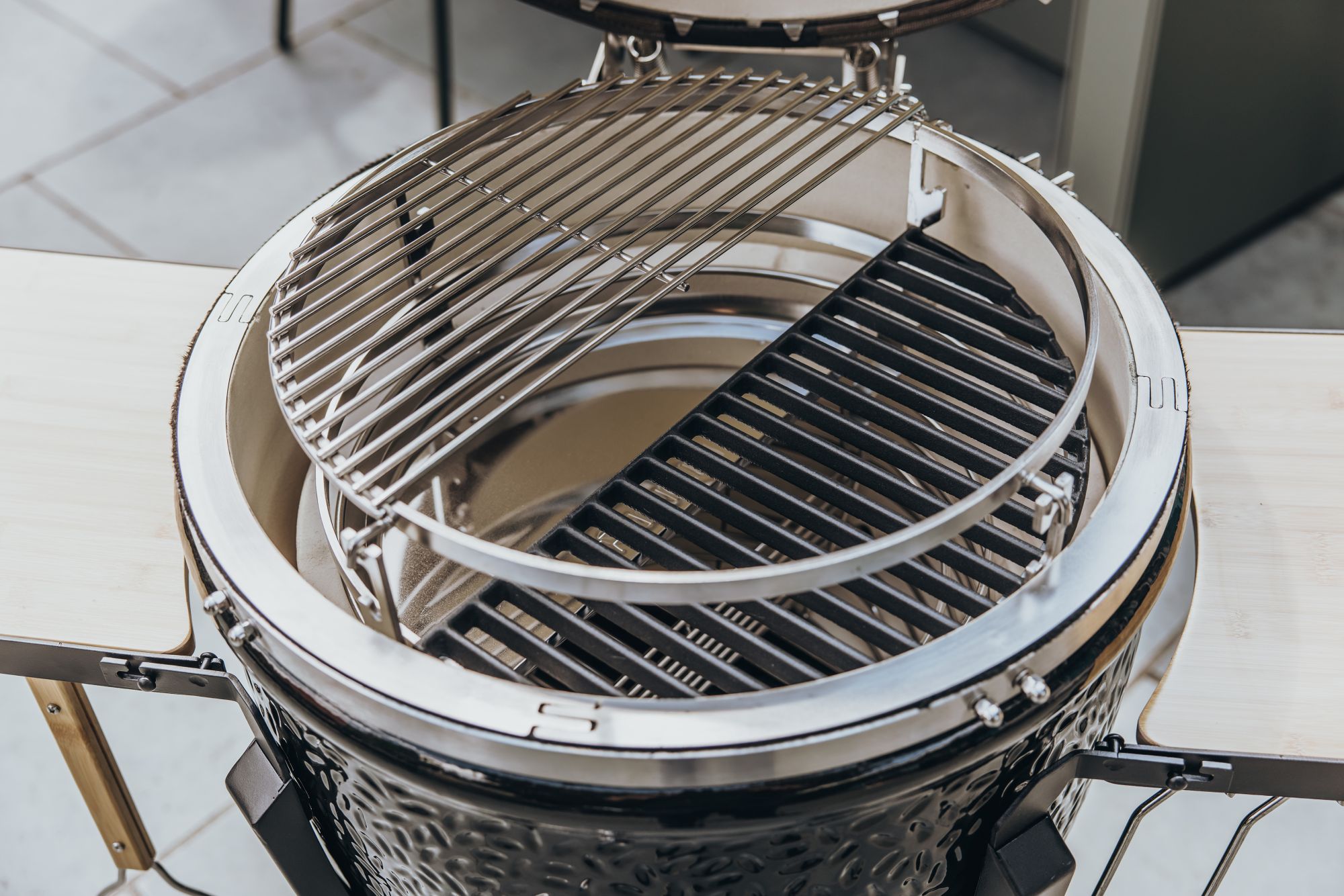 With the Smart Grid System, you combine direct and indirect grilling without converting your kamado. On one side, you grill over open coals for powerful heat and a beautiful crust. On the other side, you use a deflector stone to create a protected zone with gentle, even heat.