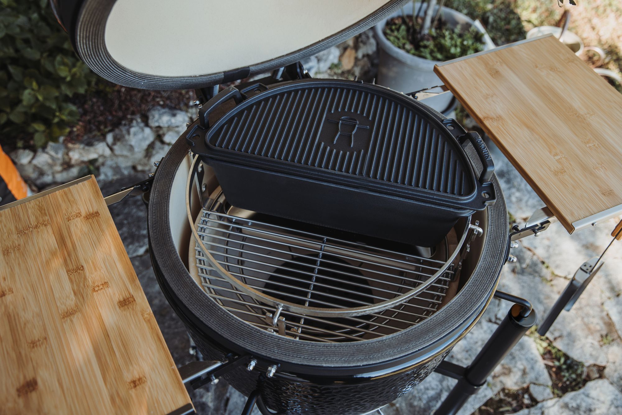 For braising, use an indirect zone in combination with a cast iron pan or Dutch Oven. The ceramic heat of the kamado remains constant, allowing dishes to cook slowly without drying out.