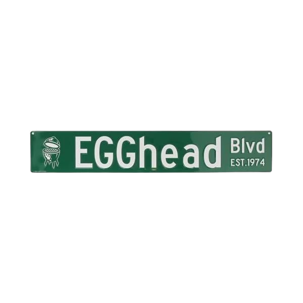 The Big Green Egg EGGhead Blvd sign is made of durable aluminum, weatherproof, and suitable for both indoor and outdoor use. It's an ideal gift for a fellow enthusiast or a collector's item for the avid EGGhead.