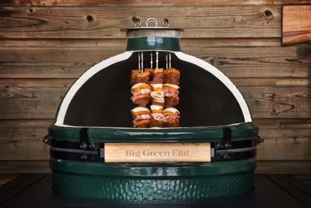 It's simple to operate: light the charcoal, remove the grates, and heat the kamado to between 175 and 200°C. Squeeze the air inlet at the bottom to a small opening, remove the daisy wheel/rEGGulator, and insert the Tandoor ring. Then, skewer your ingredients onto the specially designed skewers with barbs that hold them securely in place, and lower them into the slots through the ring.