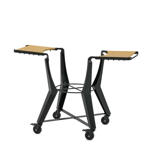 The light bamboo side tables create a stylish contrast with the matte black steel frame, giving the whole a modern and robust look. The base also features practical hanging hooks for grilling tools and accessories, and smooth caster wheels that allow you to move your kamado effortlessly.
