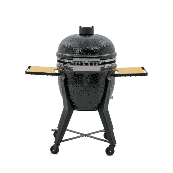 The matte black powder-coated steel base is robust, stylish, and weatherproof. The light bamboo side tables offer ample workspace and are equipped with handy hooks for your BBQ tools . Thanks to the smooth-rolling wheels, the kamado is easy to move, despite its size of over 120 kg.