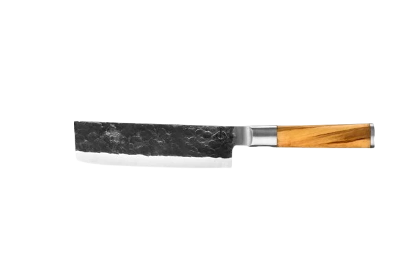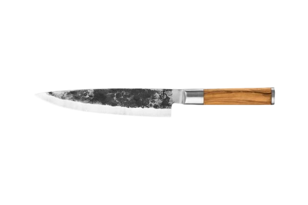 Discover the Forged Olive 3-piece knife set with a chef's knife, chopping ax and universal knife. Made of Japanese 440C steel with 58 Rockwell hardness. Each knife is forged by hand, unique in character. The knives have a 2 mm blade thickness, 18 degree cutting angle and an elegant olive wood handle. Packaged in a luxurious wooden box, with a 10-year warranty. Experience top quality and style in every cut with the Forged Olive knife set.