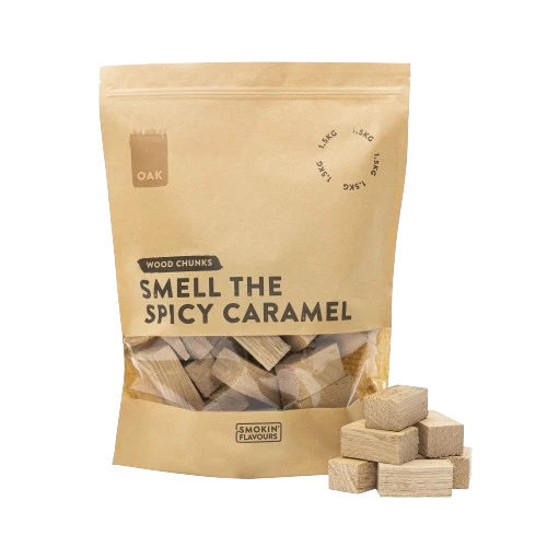 Smokin' Flavors Smoke Chunks oak, package contents 1.5 kg, spread a spicy scent with strong aromas and slightly sweet caramel notes. Excellent to combine with various dishes, especially perfect with beef. Also delicious with pork. These smoke chunks are ideal for long-lasting smoke and perfect for slow cooking. Simply place one or more chunks dry in the charcoal and let it smoke quietly for a few hours. A tasty addition to beef, pork and poultry. Experience the rich aromas with Smokin' Flavors.
