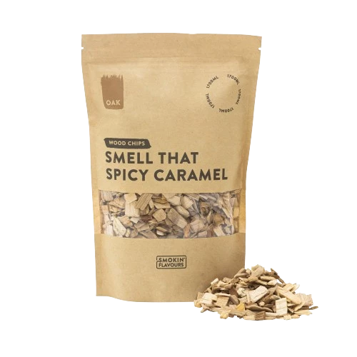 Smokin' Flavors Oak smoke chips, package contents 1700 ml, spread a spicy scent with strong aromas and slightly sweet caramel tones. Excellent to combine with almost anything, especially perfect with beef. Also delicious with pork. These smoke chips are designed for hot smoking on your charcoal or gas barbecue. Use a smoker box or sprinkle a handful of chips into the charcoal for a flavorful smoking experience. A versatile addition when preparing meat on the barbecue with Smokin' Flavors.