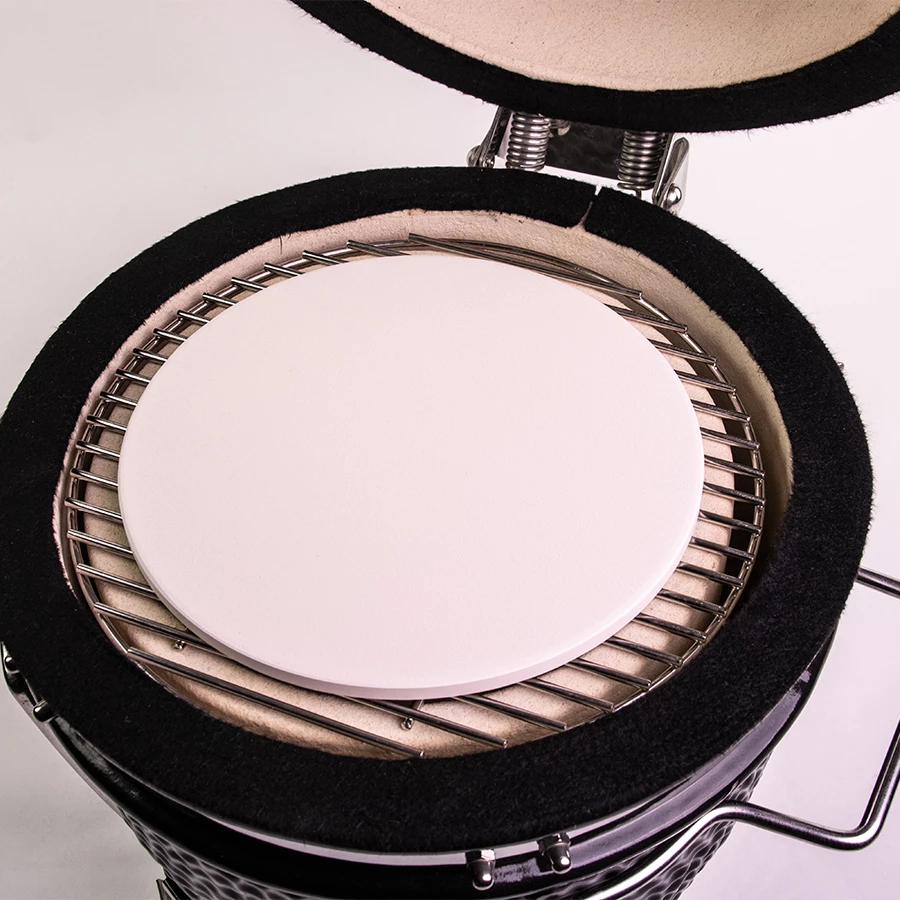 Deze keramische steen verdeelt de warmte gelijkmatig en behoudt overtollig vocht, waardoor je altijd een krokante pizzabodem krijgt. Voor het bakken van brood en vooral pizza is een hoge temperatuur vereist, met brood tussen de 200-250 °C en pizza tussen de 350-400 °C. Plaats ruim van tevoren je multilevel lift, hitteschild en standaardrooster, waarop je de pizzasteen plaatst. Zonder hitteschild zou de pizzasteen zo heet worden dat de bodem van je pizza of brood direct zou verbranden.